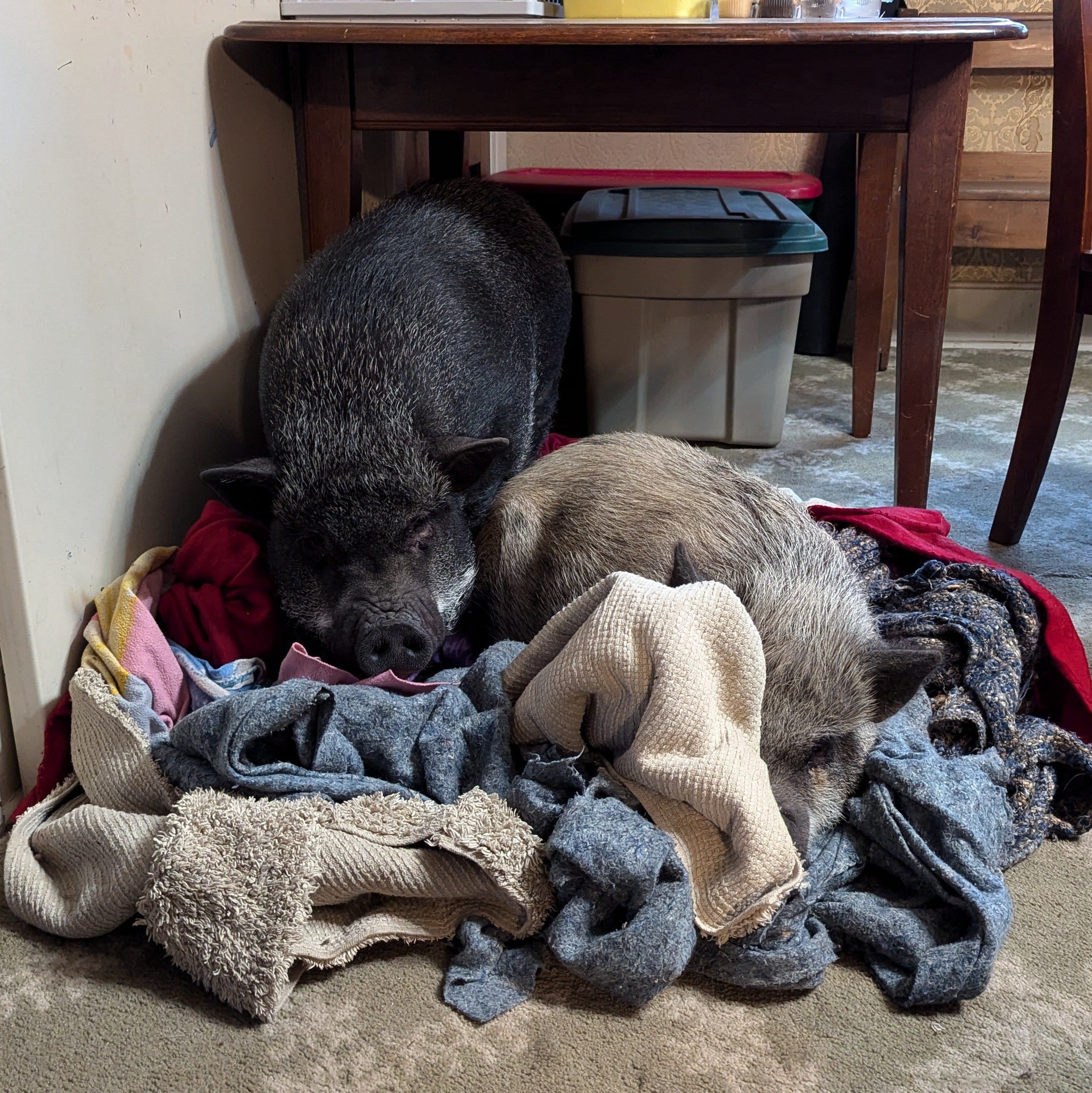 The pigs are no less stubborn than my teenager, but in the opposite direction. They do everything in their power to stay warm. Miniature swine have the same temperature preferences as humans, but with the added disadvantage of not wearing clothes. It’s not for a lack of trying. My oldest pig, Gilly, tries to steal the kids’ coats all the time. When I let her and Luna out of the pig room and into the main part of the house, she roams in circles, grabbing anything soft and movable. It drives me crazy, especially when I’m trying to work. It’s hard for me to stay focused when there’s a swine behind me actively endangering my marriage. Her behavior contrasts sharply with that of Luna, who’s happy just to be in the house. As soon as I let her out of the pig room, she plops down on the dining room carpet and tucks her legs under herself. She’ll happily remain there as a pig loaf for the rest of the day. We should all aspire to be so unbothered.