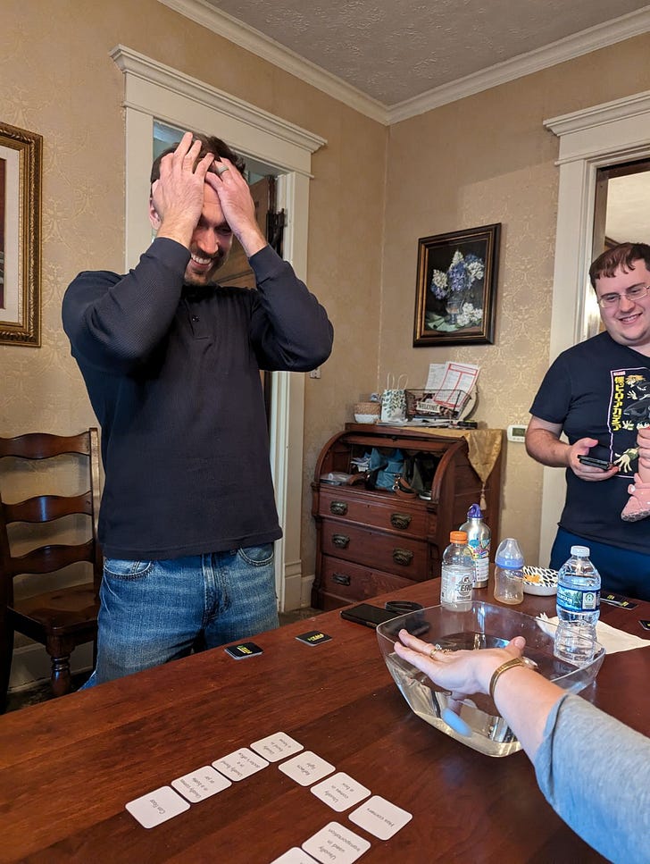 We had nine players at our FitzIt table Saturday, including our usual board game friends/relatives plus my mom and dad. The crucial moment came when my friend Lila said her word was cotton ball. One of the descriptor cards she used was “can float.” That’s when all hell broke loose. How can a cotton ball possibly float? It’s cotton. If you were jumping off a sinking ship, you wouldn’t use a stuffed animal as a flotation device. That would be a one-way trip to Davy Jones’ locker. (Full disclosure: I don’t know who Davy Jones was or why he went to high school at the bottom of the sea.) Lila insisted that cotton was, in fact, buoyant. Ridiculous. Accusations and counter accusations flew across the table. Everyone got in on it. Nine actual adults yelled passionately about what would happen to a white puff ball in the water. Then someone—possibly me—had a brilliant idea: Why don’t we just test it out? The rules of FitzIt specifically forbid you from looking up answers, but nothing prevented me from conducting original scientific research. We just so happened to own cotton balls. Why? Nobody knows. The only first aid in this house consists of me driving myself directly to the emergency room because I’m once again on the verge of death. I’m an all or nothing sort of guy. I ran upstairs to get the cotton balls and rushed back down to the kitchen. There, I pulled out the largest clear container I could find and filled it all the way to the top with water. I set it on the dining room table. A hush fell over the crowd. Actually, it was the opposite. The shouting reached a crescendo. I dropped the cotton ball in the water. It stayed at the surface. It could float.