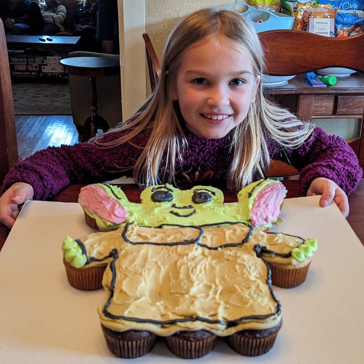 There was more to the day than destroying everyone’s faith in everything. There were also cupcakes. Lola engaged in her usual frosting magic. Waffle requested a Grogo theme. Rather than creating individual cupcakes with big green ears, Lola combined all the cupcakes to create one big baby Yoda. It looked good and tasted better. The only flaw was that the frosting had to run between cupcakes to create a solid image. When you pulled a dessert out from under it, it was an open question as to how much frosting you would get. Sometimes you got three cupcakes worth of sugar paste and sometimes you got none. It was all the unfairness of life condensed down to a single baked good. Those who ended up with tragically frostingless cupcakes weren’t entirely out of luck. We also set out our sixty pounds of Halloween candy for all the guests. It was not a time for moderation. It was a day of maximum sugar and maximum volume. You only turn eight once. Waffle could live another hundred years and never have a party that goes that hard, even if she wasn’t at the center of most of the chaos. Then again, I shouldn’t lay down that challenge just yet. She’ll turn twenty-one someday.