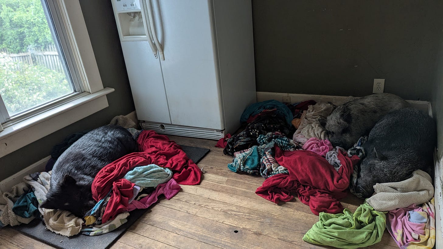 This Saturday was an especially busy day of chores in preparation for the party. While the pigs were outside wrecking the fresh grass, I made the critical mistake of trying to clean up their room. I didn’t realize how dirty the space was until I scrubbed down parts of it. I forgot that those brown baseboards were supposed to be white. I had only planned to wash their blankets and vacuum the room, but once I got started, I fell down the black hole of “and one more thing.” By the end of it, I was on a stepladder dusting transoms and vacuuming cobwebs from the corners of the ceiling. The pig room hasn’t been this clean since before we had pigs. It’ll stay that way for the next six to twelve hours. If I had been smart, I would have waited to clean that room until ten minutes before the party. By the time people actually get here for the celebration, that room will look just as dirty as it usually does. I took pictures of it in unnaturally pristine condition to prove it happened. I’ll show people those images on my phone and ban them from entering the actual room. If they need a beer from the fridge in the pig room, I’ll send a kid to fetch it. It’s not like they’ll have anything better to do at their own party.