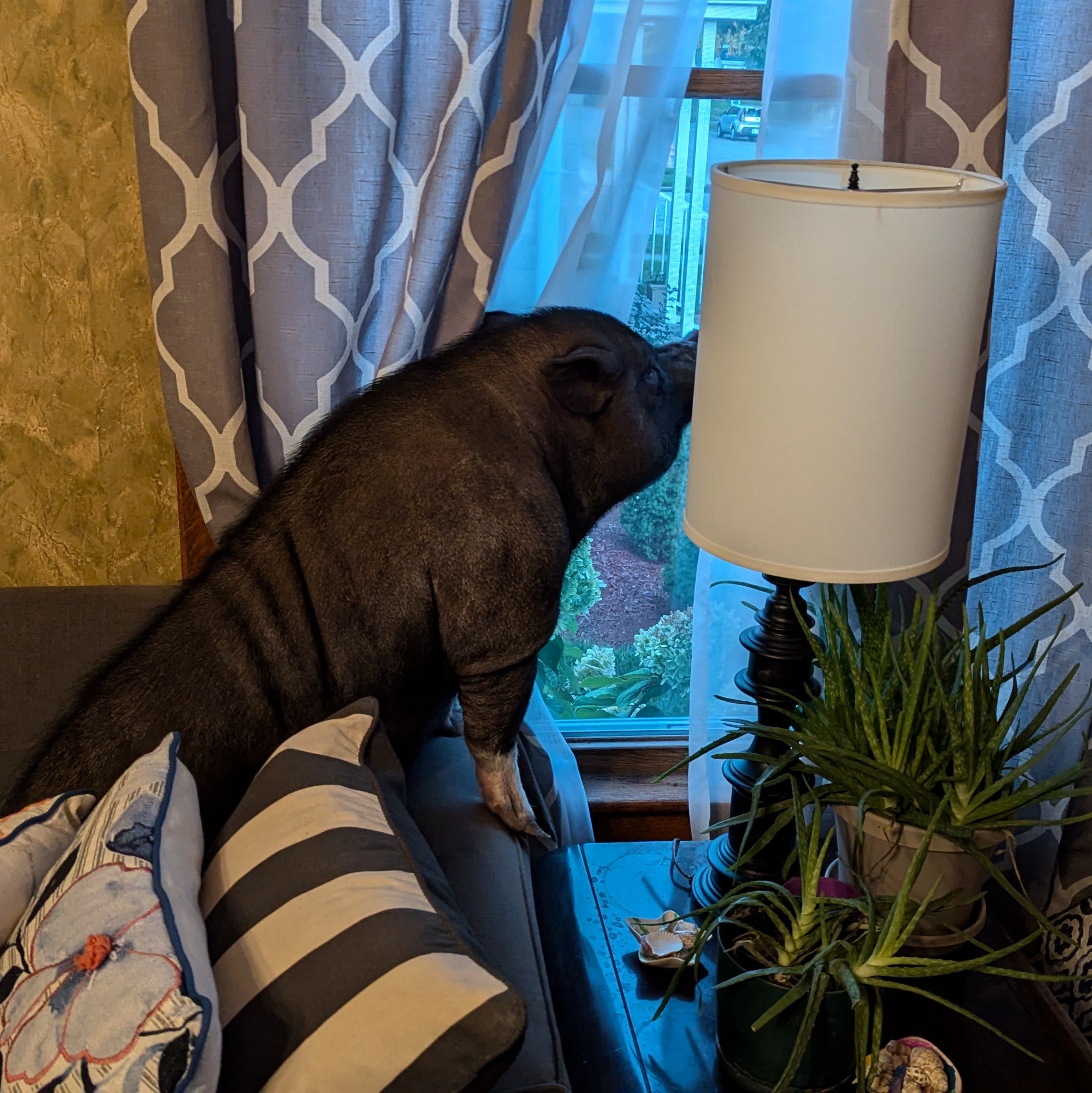 Since then, Onyx has continued to show a natural curiosity. Shockingly, that hunger for knowledge isn’t driven solely by his literal hunger. He’s particularly fascinated by windows. He regularly climbs onto the couch to stare out the opening behind it. At first, I thought he merely wanted to tear down the curtains. That would have been curtains for him in more ways than one. Lola will evict any and all threats to the drapery. Instead, Onyx gently moved the curtains aside so he could look out. He repeated the same gesture on a different couch in the front room looking out another window. It was a new way for him to experience glass. Rather than looking at himself, he was gazing beyond. His choice of windows was revealing. He didn’t bother with the one in the pig room, which overlooks the backyard where he spends most of his time. He preferred the front windows. Onyx wants to see a place he has yet to go. He’s the Christopher Columbus of pigs, yearning for exploration and discovery. If that discovery happens to include new food, all the better.