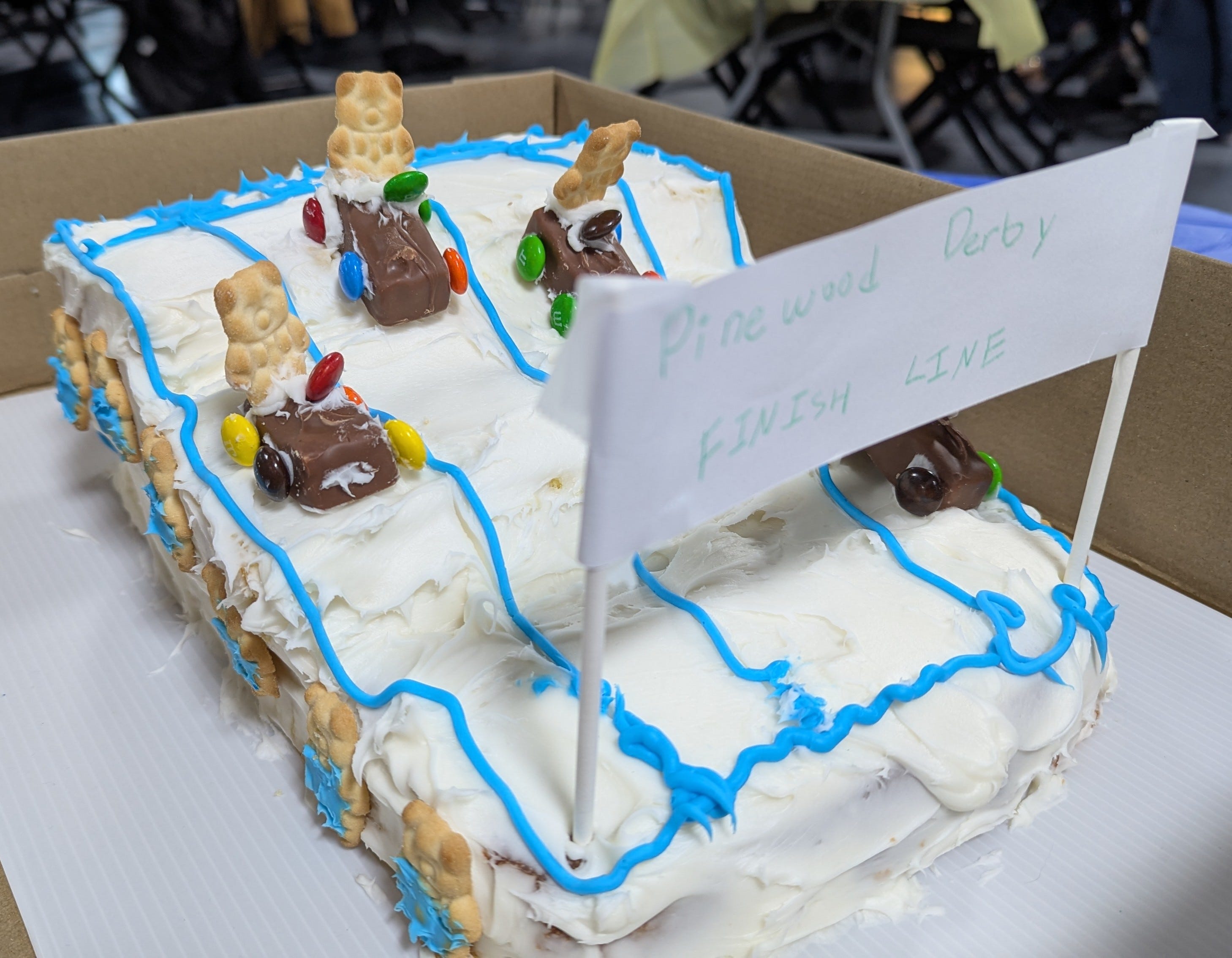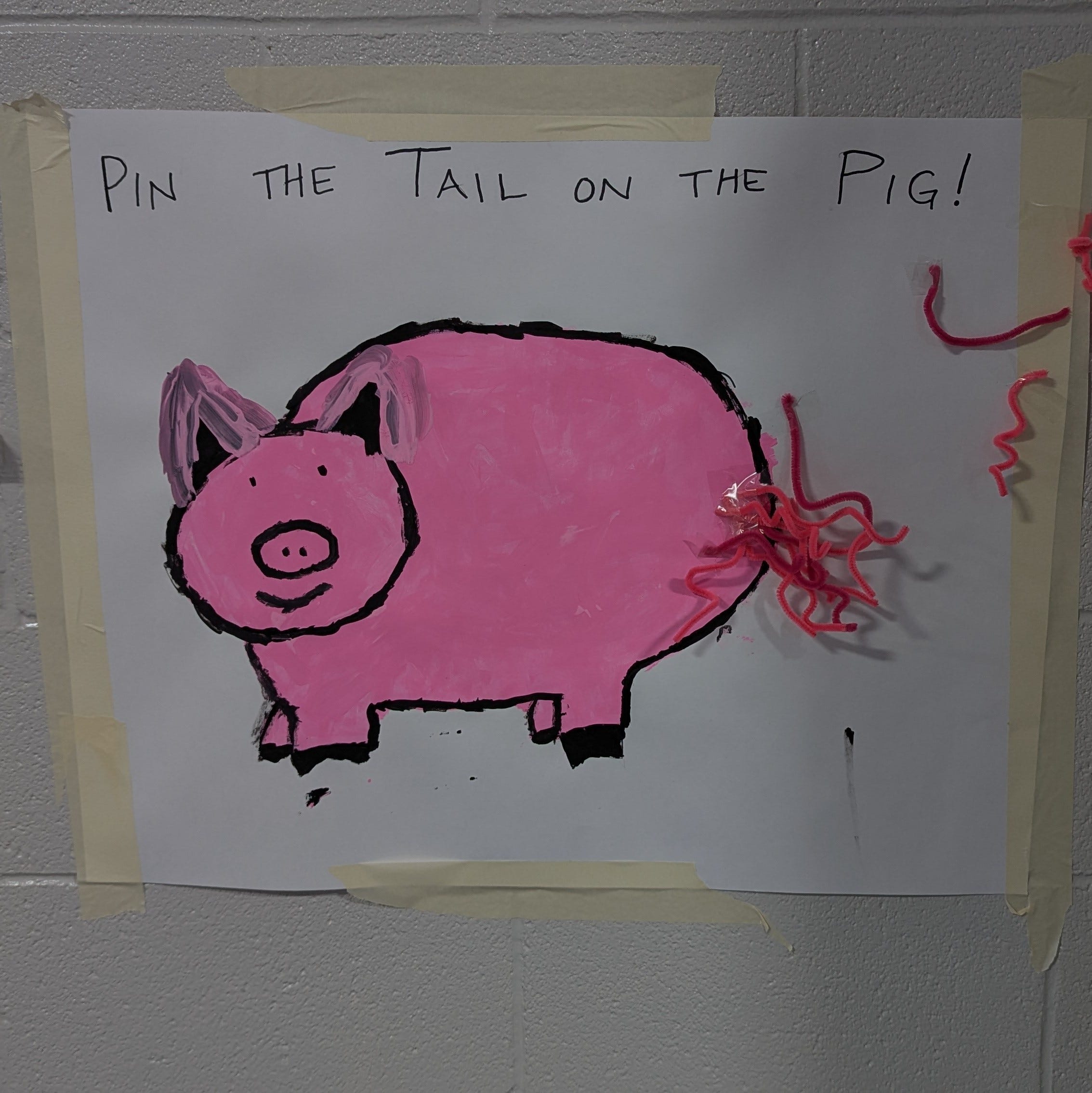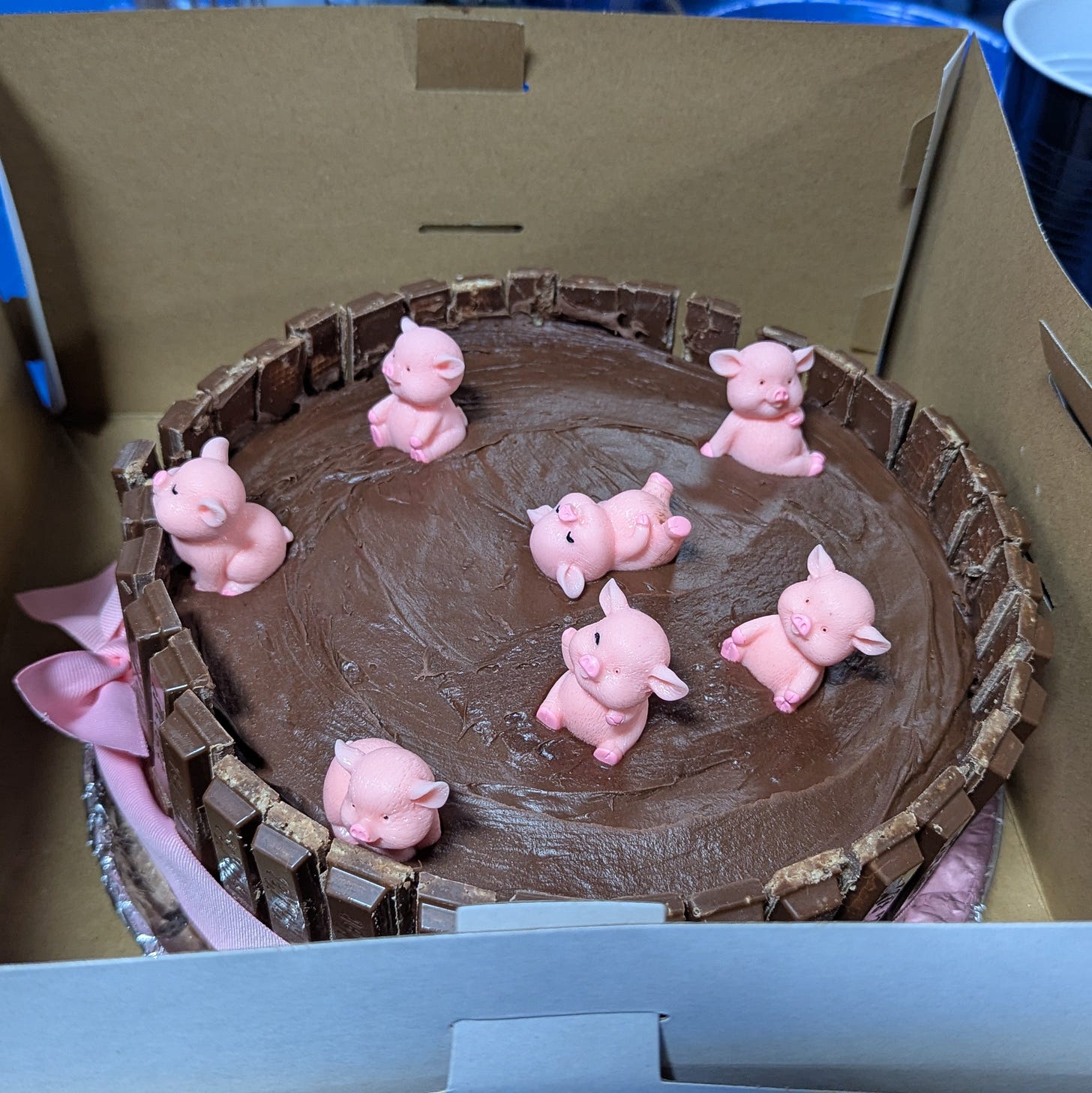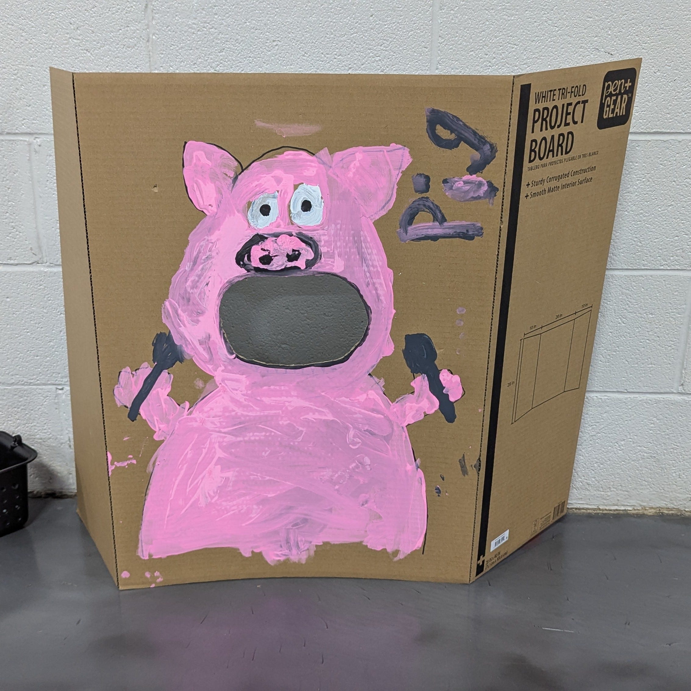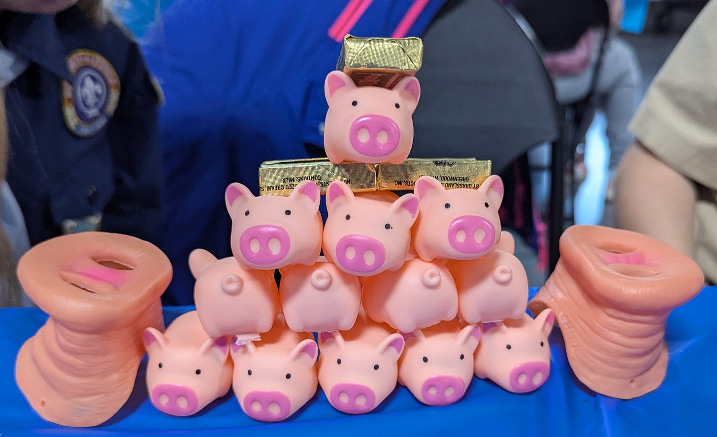 Lucy was devastated that she couldn’t go to the Blue and Gold Banquet, but not as devastated as Lola. We still went to the ceremony to help out and support the other scouts. Shortly after we got there, Lola asked me to take her home because she couldn't stop crying. She's a small person with big feelings. Let the record show that she wasn't nearly that upset about me missing trivia night. Thankfully, Lucy’s new BSA troop leader came to the rescue. She offered to have a private crossover ceremony for Lucy at the next meeting. Lucy will get to walk across that wooden bridge after all. Even better, we got her, not one, but two cakes at the dessert auction at the banquet. One of them was pig themed, of course.