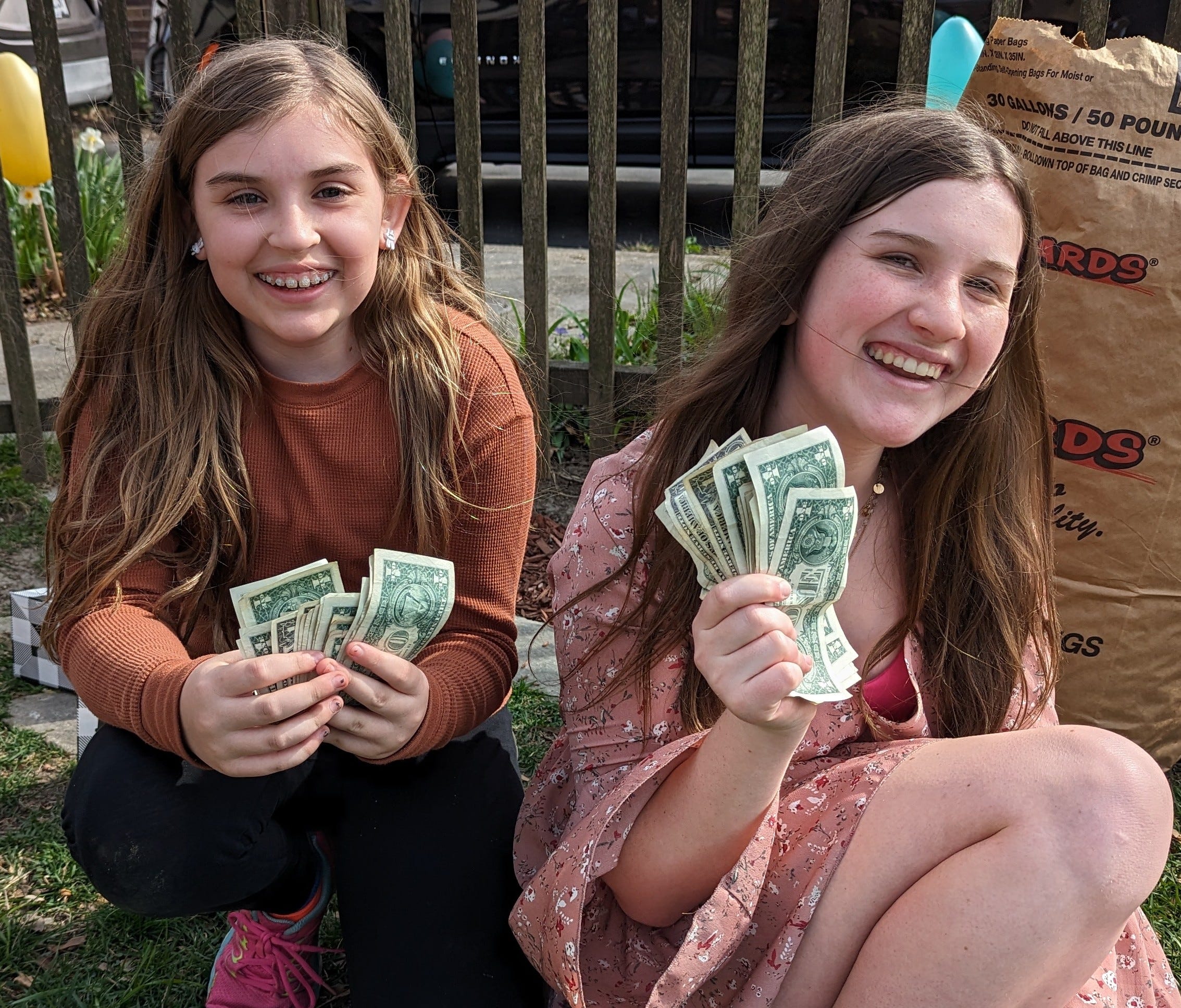 I’m too old to shuttle run anywhere. Instead, I slowly plodded along, carefully scooping up each egg and counting on my superior size to keep me safe. It was the brontosaurus defense. Betsy and Mae, by contrast, ran as hard as they could. I’m not sure what Lola did. She’s small enough that I lost track of her in the fray. For the most part, my brothers and I avoided combat. We’ve learned over the years that the best strategy is to go for the uncontested eggs first and reserve direct confrontation for near the end. When I attempted to scoop up my final egg, Mitchell shoved me hard from behind. I nearly impaled my face on the picket fence. I let that egg go. My sister Sasha’s boyfriend dove in behind me but stepped on the egg, crushing it. Mitchell scooped up the loose bills and put them in his bag. When the dust settled, Lola and I each had nine dollars. Betsy had seventeen, and Mae came away with an astounding nineteen, winning Easter. Not bad for her rookie performance. I don’t have to be the fastest or the strongest guy in the hunt anymore. I just need a lot of minions. It goes to show that, if you wait long enough, kids eventually pay for themselves. Surely the combined thirty-six dollars Betsy and Mae collected will offset all the other expenses in their lives. How much does it cost to go to college?