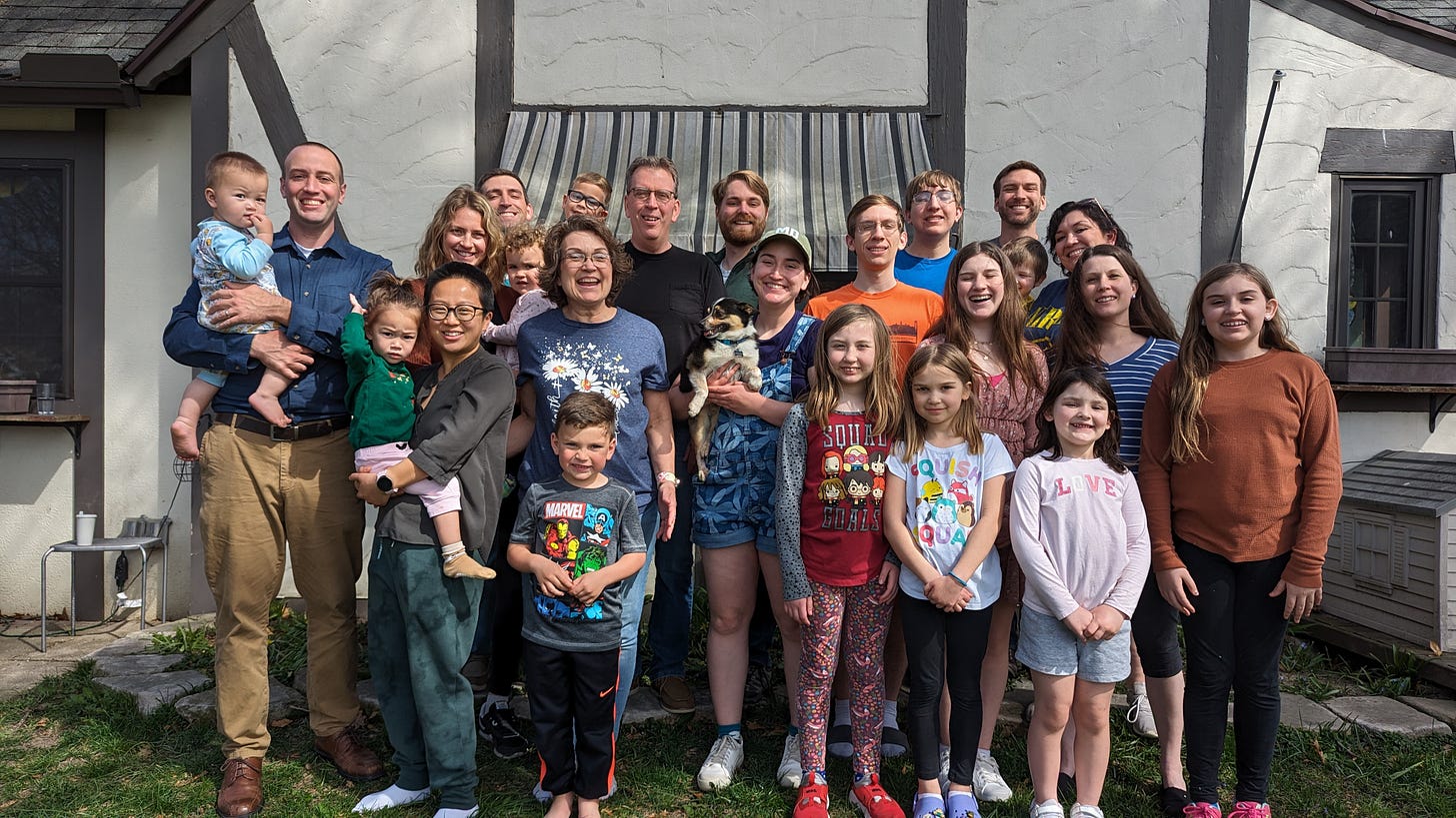 As excited as we were to have Harry at Easter, he was still late to the party. He didn’t arrive until day two. Day one, which was Friday, was a more subdued affair. I was the first to arrive with my four girls. Lola had to work, as always. My brother Mitchell got there next from Missouri with his wife and three kids, followed shortly thereafter by my sister Ella with her two. After that was my brother Arthur, who had to walk down from a whole two houses away. He arrived exhausted after his harrowing journey. It’s a shame there were no rest stops along the way. He didn’t have the shortest trip of the day, though. That honor went to my brother Nathaniel, who still lives at home. He was two rooms away, yet he was the last of the first day arrivals. Teenage boys have a special level of antisocialness that’s impervious to any form of grace or tact. I wanted to make fun of him, but my mom said the rest of us were all the same way at his age. The difference is there were more of us in the house at the time, so we were antisocial together. Being an introverted misanthrope is more fun in a group.