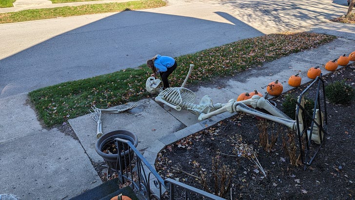 As much as I hate to admit it, the transitional time of daylight savings does fit this transitional time of year. (How’s that for a transition?) Halloween is over, Thanksgiving isn’t quite here, and Christmas has already taken over everything. People’s houses could be decorated for any one of three different holidays. At my home, we’re still stuck in Halloween mode. We’ve got thirty pumpkins out front that aren’t quite gross enough yet to feed to the pigs. Until this weekend, we also had a twelve-foot-tall skeleton. Our original plan was to leave it out year-round and decorate it for the seasons. It could have a pilgrim hat for Thanksgiving and a Santa hat for Christmas. For the Fourth of July, we’d give it a machine gun with a chainsaw bayonet. If that doesn’t scream, “Freedom,” it at least says, “Go away.” As for Halloween, we had numerous ideas of what costume to give our boney friend, none of which we implemented. Being a giant skeleton was sort of enough. Also, we’re lazy. That’s when I realized that, if we left it up all year, it would just be a plain skeleton for every other holiday, too. Our skeleton fashion show was never going to happen. Mr. Bones came down Sunday afternoon. His blatant nudity was upsetting the neighbors.