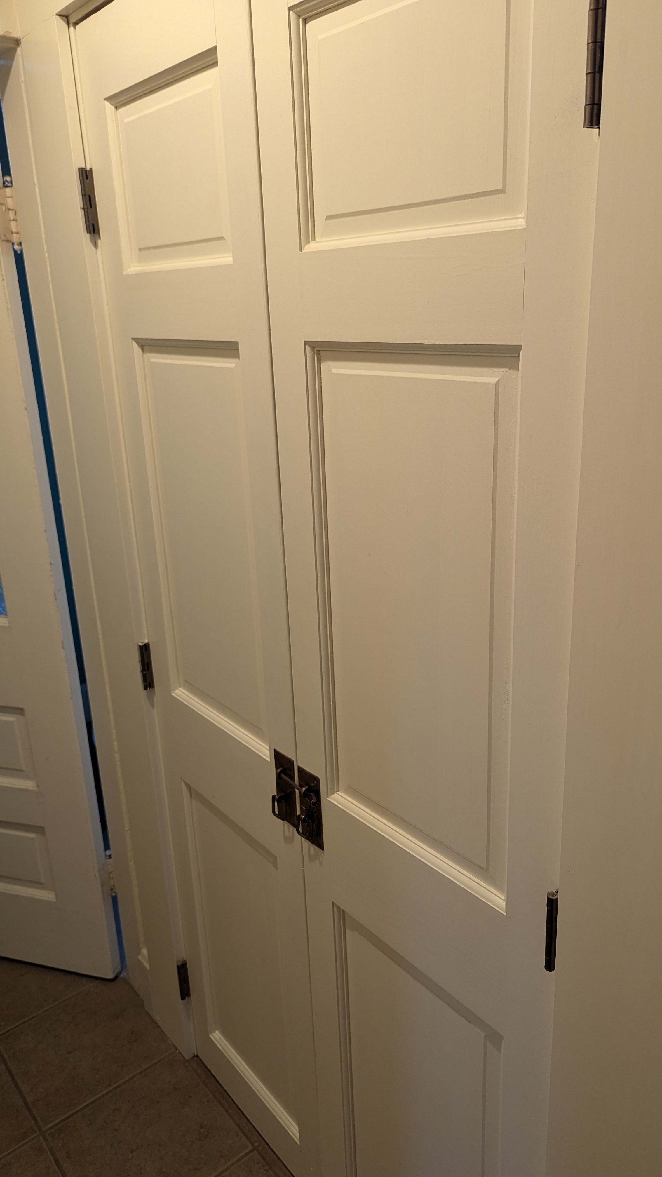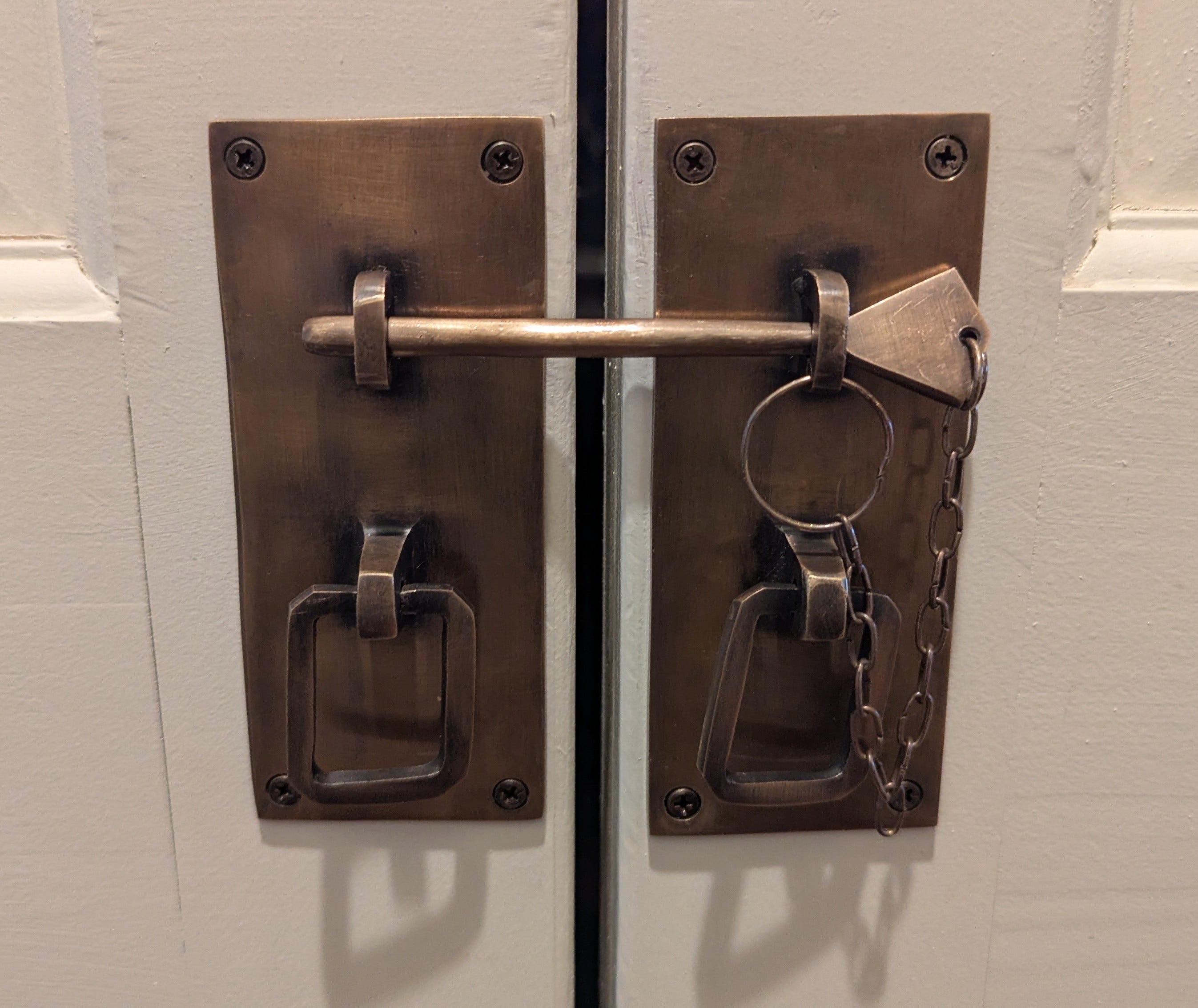The handles arrived the days later. They looked even better than in the pictures (as if Lola would ever pick something in bad taste). They were hand-crafted brass loops on metal plates with a pin to hold them closed. That last part was vital. We didn’t want any of our indoor mini livestock getting into the pantry. We weren’t sure if that pin would be enough. None of the reviews said anything about stress-testing the slide lock against pigs. I took a chance on them anyway because I didn’t want it to be another ten years before we moved forward. It still might have taken a decade to get the handles from the box to the doors if not for another fortuitous occurrence: My father-in-law, Bob, who can fix anything, was coming over to babysit. I casually sent him a text that mentioned, if he came early, he could also do some home projects. That was like telling him he won the lottery. He’ll never miss a chance to save the day.