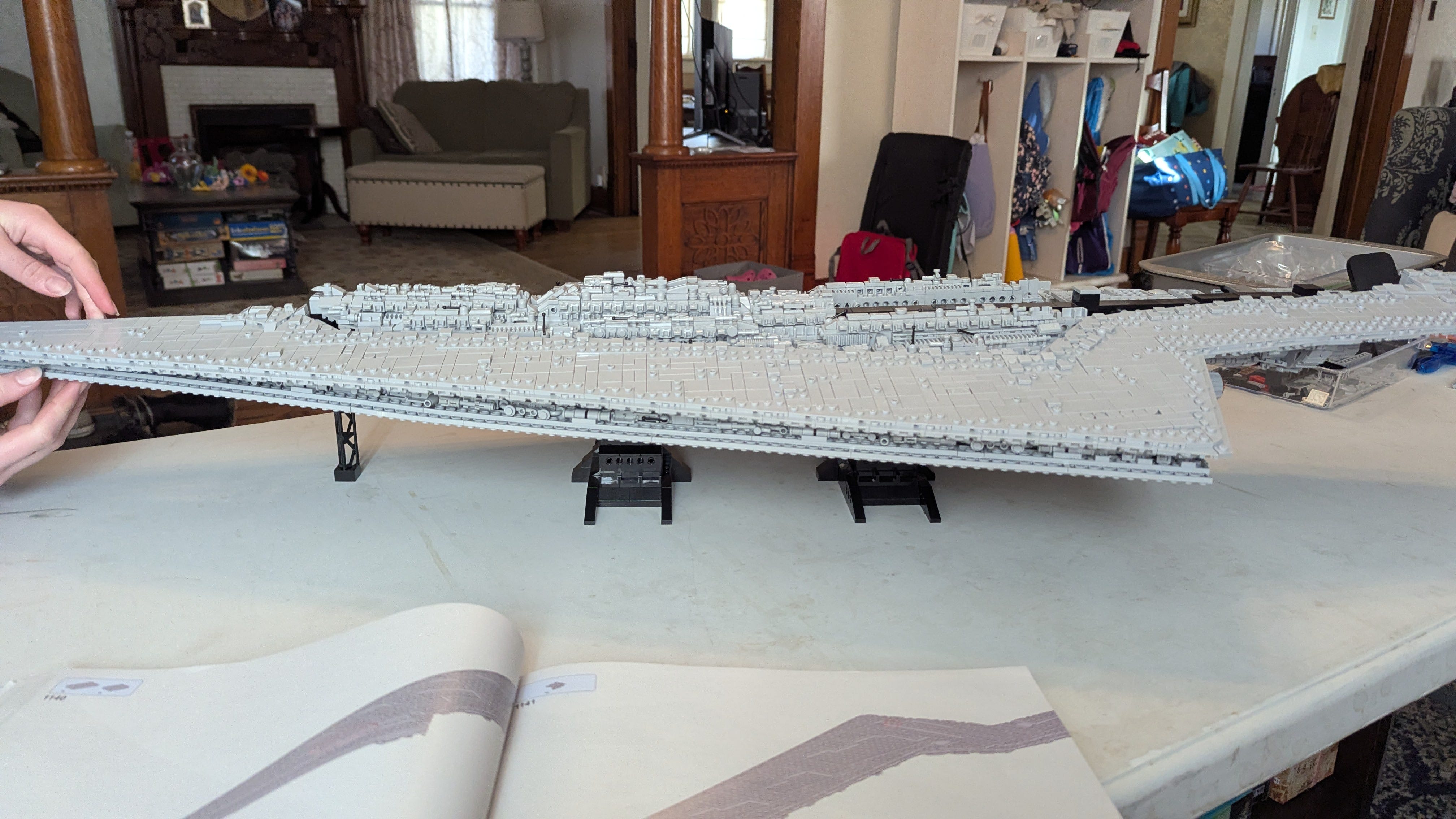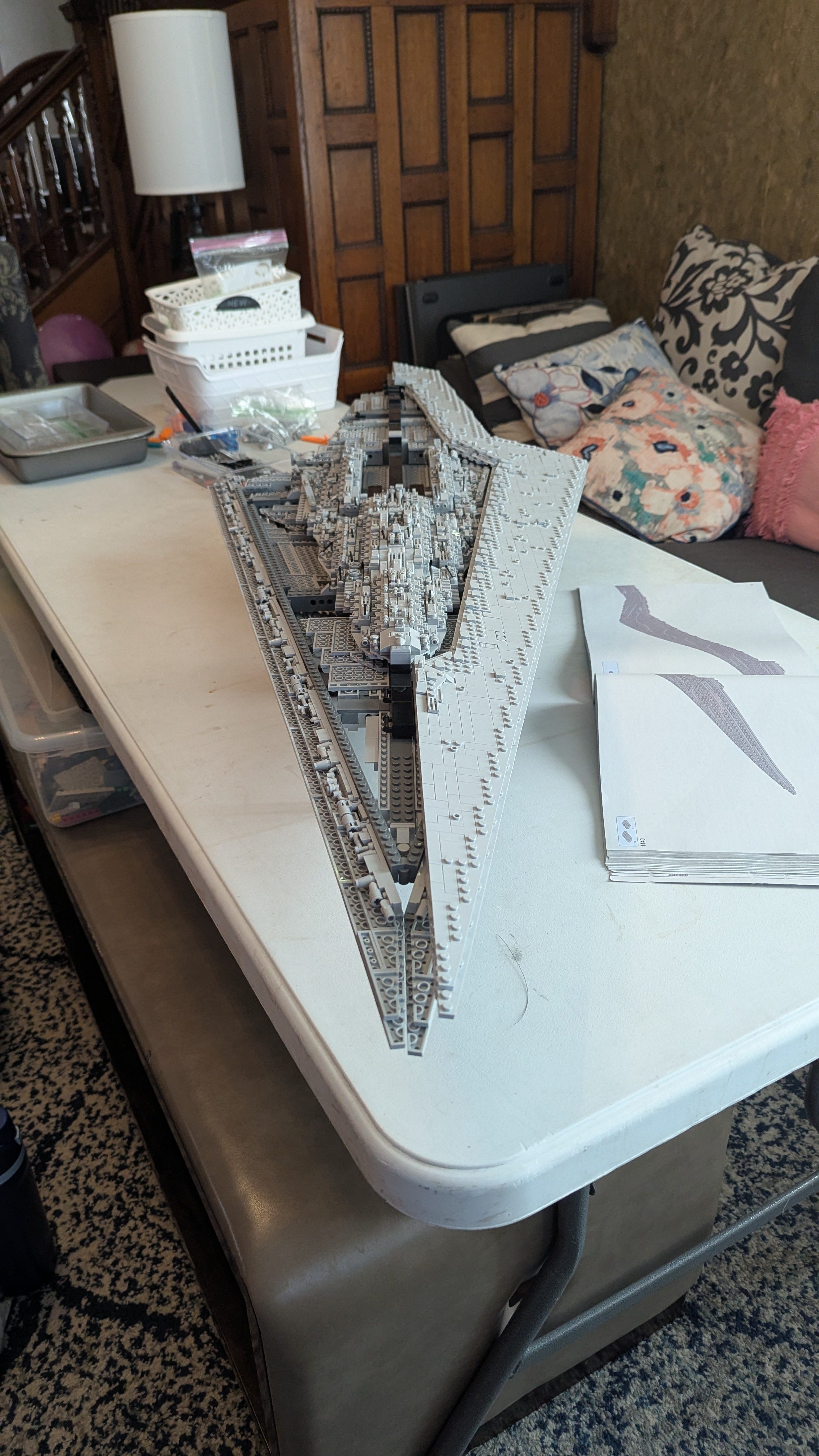 I’m not out of the woods yet. The ship is basically a long, narrow pyramid turned on its side, with each of the four main planes facing outward at a different angle. The four individual sides consist of thousands of pieces assembled over hundreds of pages of instructions. Those huge sections have to be attached to the ship in one nerve-wracking step each. I couldn’t get the first one, which was on the bottom, to connect at all. I called in Lola for assistance. She has more precise fingers and more patience than I do. It still took her forty-five minutes. When I say this set is fiddly, I mean it. If you press too hard, it will snap in half. If you give it a mean look, it will burst into flames.