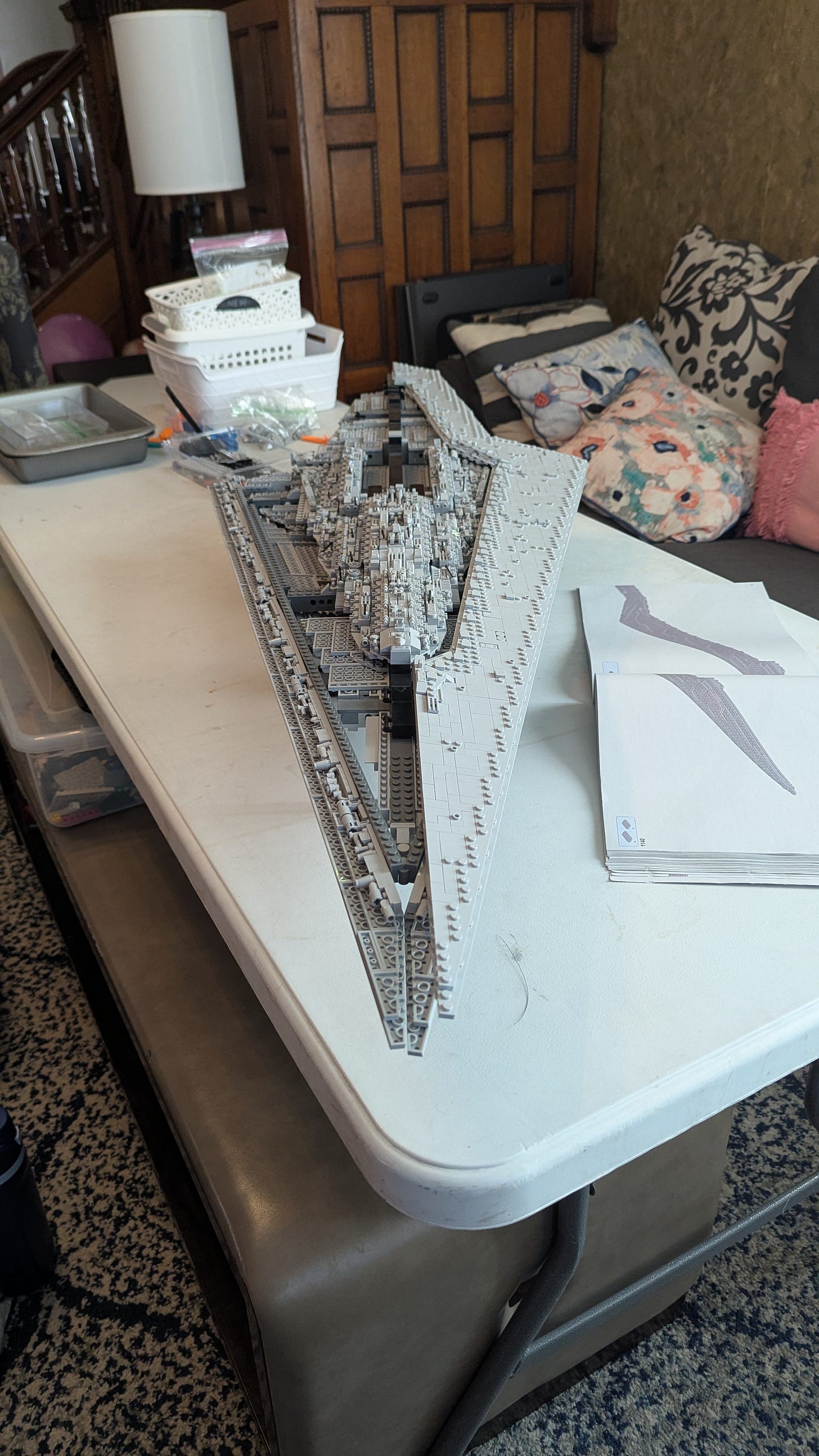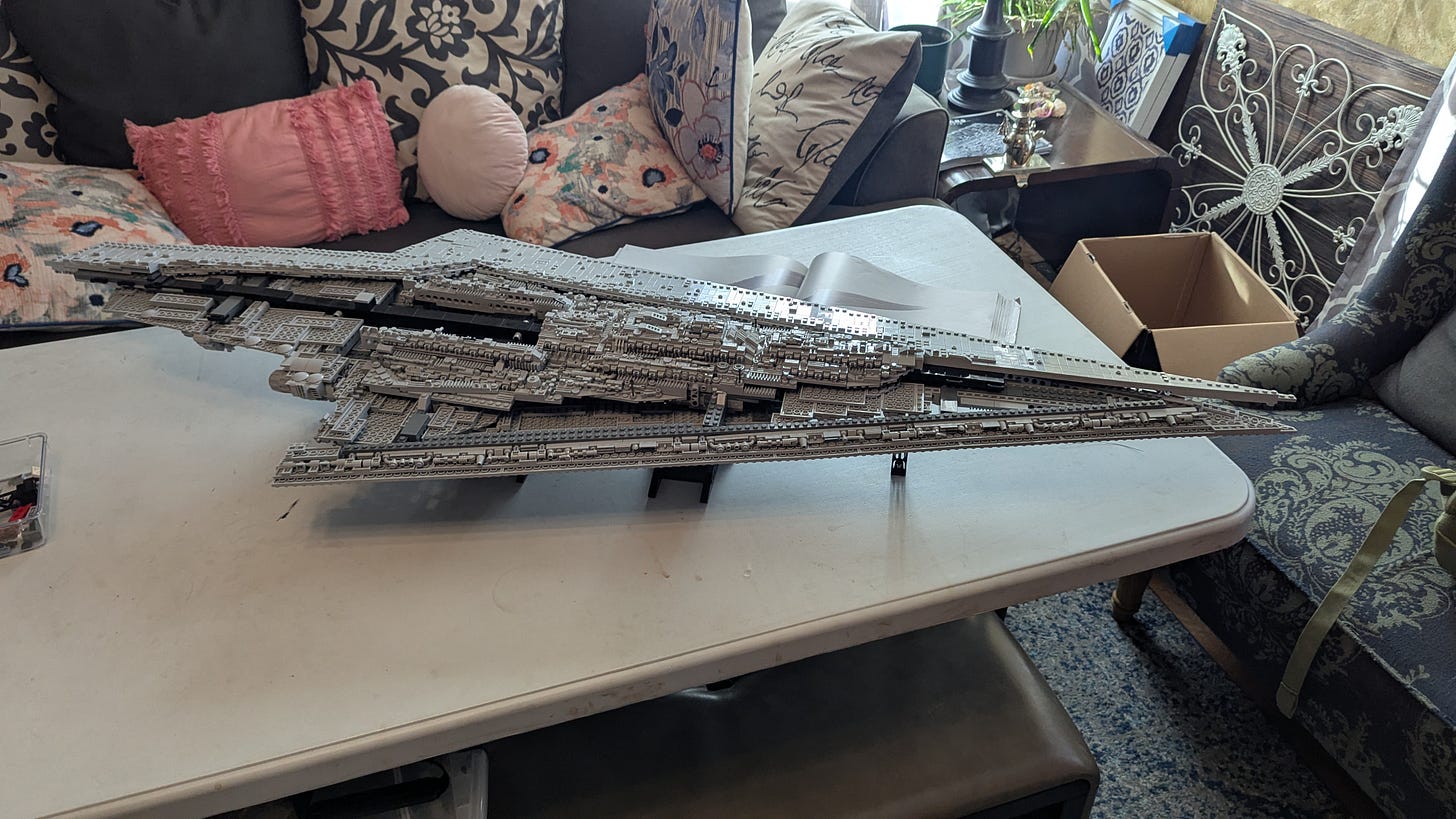 I hate leaving things unfinished. That doesn’t mean I don’t leave them that way. It just means I spend a lot of time in a state of hate. I started this paragraph two hours ago and finally got around to adding these extra sentences right now. I’m the same way with the projects in my house that actually matter. I wrote an entire newsletter about how I had gone nine months without picking out and installing handles on our new pantry doors. I could have used the same time to make a decision and do the installation. But then I still would have had to have come up with something to write about, so maybe I made the right call. I had a similar situation with the Lego Super Star Destroyer that’s been vexing me since my kids’ Triple Birthday Party last May. I’ve written multiple newsletters about the times my family and I have repeatedly tried and failed to assemble it. If I had applied all of that writing time to my latest attempt, perhaps I’d be done by now. For once, I have visible progress to report on both fronts. I could have waited for this announcement until both the pantry handles and Lego set were done, but this might be the furthest I ever make it. Let’s enjoy this milestone for what it is and put off the actual work of finishing a little bit longer. I’m okay with embracing my self-hatred one more time.