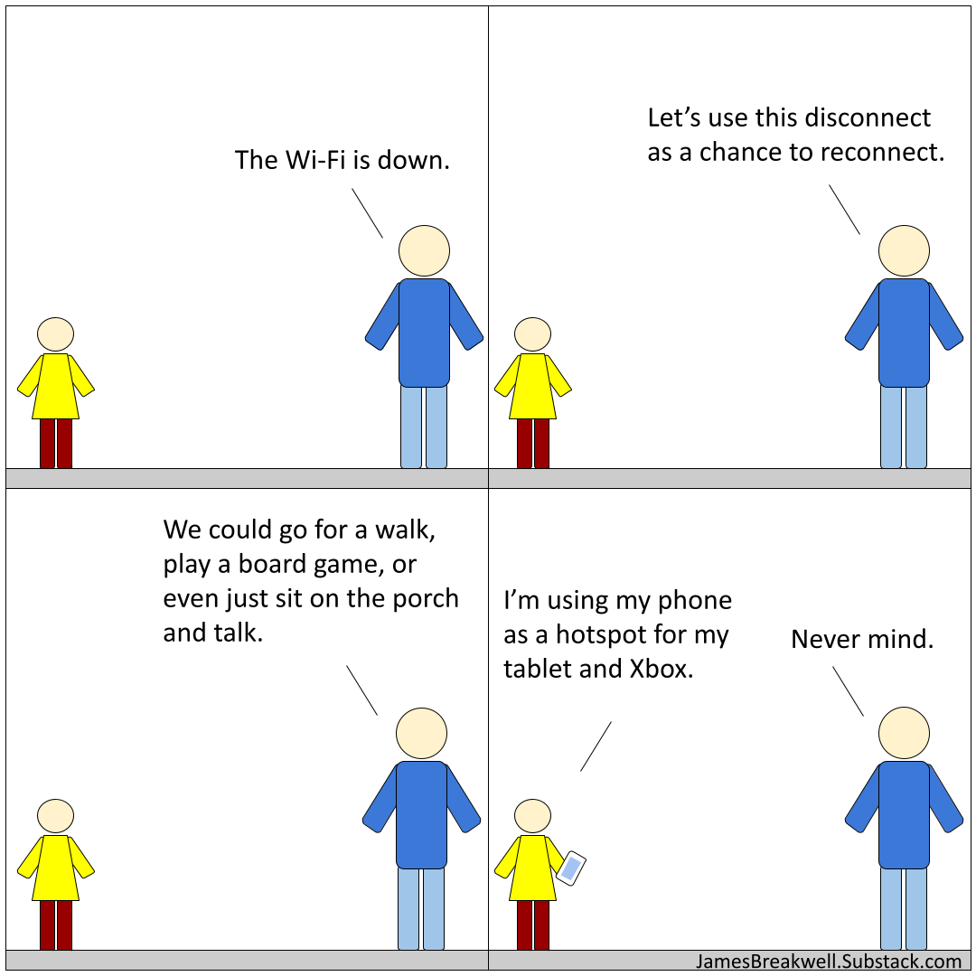 Webcomic: Always OnJames BreakwellOct 30, 2024∙ Paid365ShareAt this point, for us to completely lose access to the internet, the world would have to end. That’s a good thing.Continue reading this post for free, courtesy of James Breakwell.Claim my free postOr purchase a paid subscription.PreviousNext