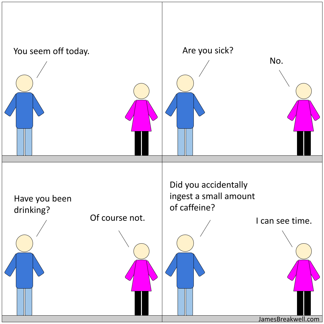 But short of that, I can sleep through pretty much anything. Caffeine doesn't really phase me. I don't do coffee or anything else. I mean, why would I wanna be more awake during the day? That seems like a terrible idea. My wife is very different, though. She also doesn't drink coffee. But more importantly, she doesn't have any soda or any other kind of beverage that has caffeine in it. She can't stand it if she has the slightest amount. She feels jittery. She's like a hummingbird. She can't control herself. I don't mean she's crazy or anything like that. I mean, she says she has trouble forming sentences. I have no way to test this empirically. This is just what she tells me. Its effects are on her, but I have no reason to doubt her reports. She is a caffeine hyper responder. She could drink one cup of coffee and stay awake for the year.