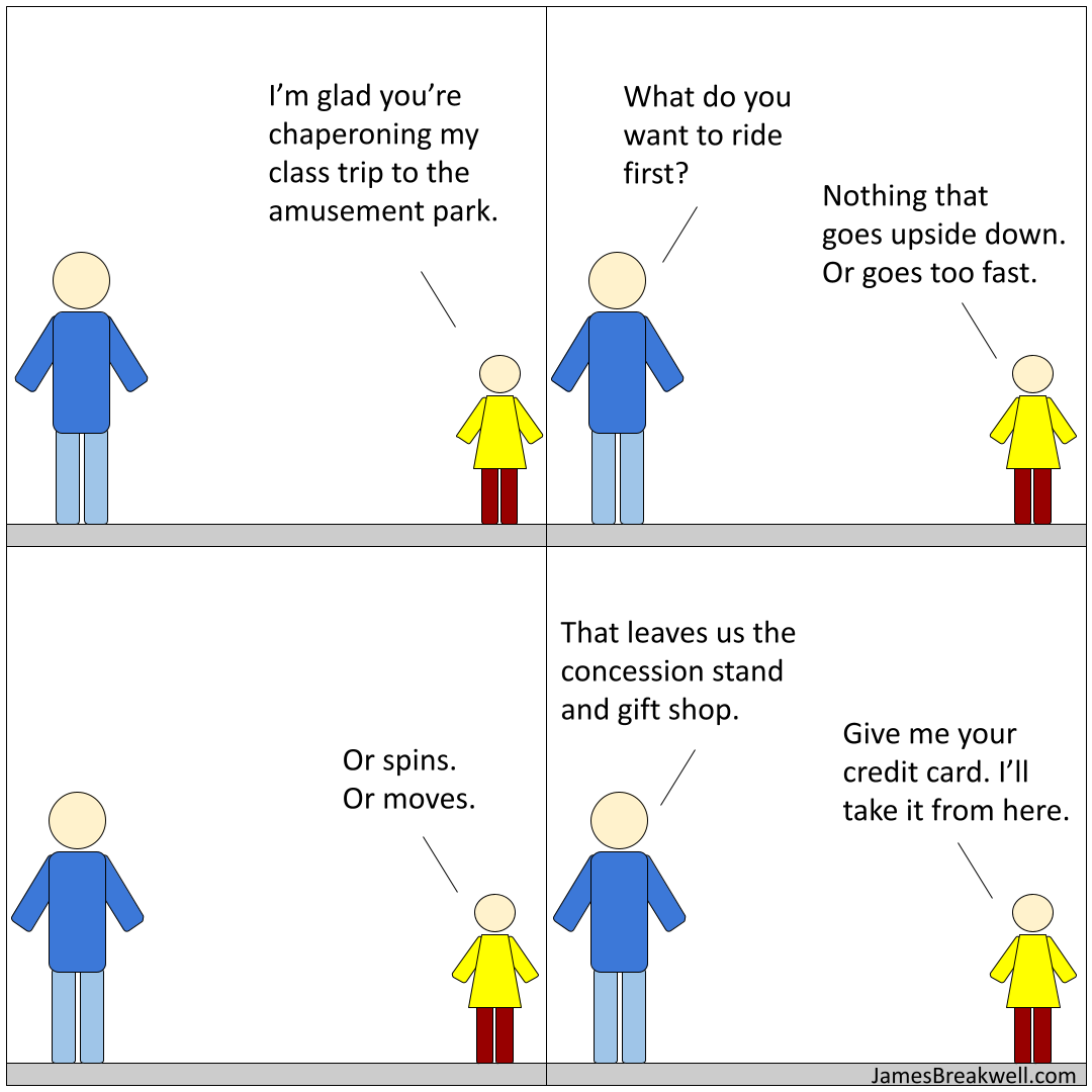 I’m chaperoning Betsy’s trip to the amusement park tomorrow. We have very different ideas about what constitutes a good time, but as long as we do it together, it will be great. Unless we go with my idea of fun and ride the roller coasters. Then she’ll be traumatized for life.