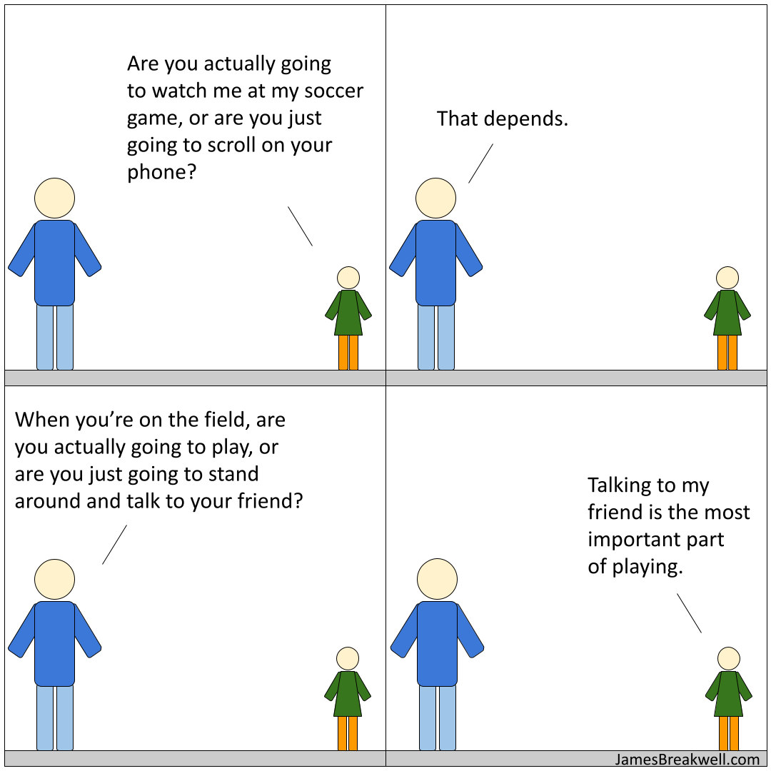 People have different motivations for doing sports. Some people want to get exercise and stay healthy. Some people want glory and eternal fame, you know, because we all get famous with youth sports. That's just the way that goes. But the final reason is to be social. That's definitely what at least one of my children wants out of the experience.
